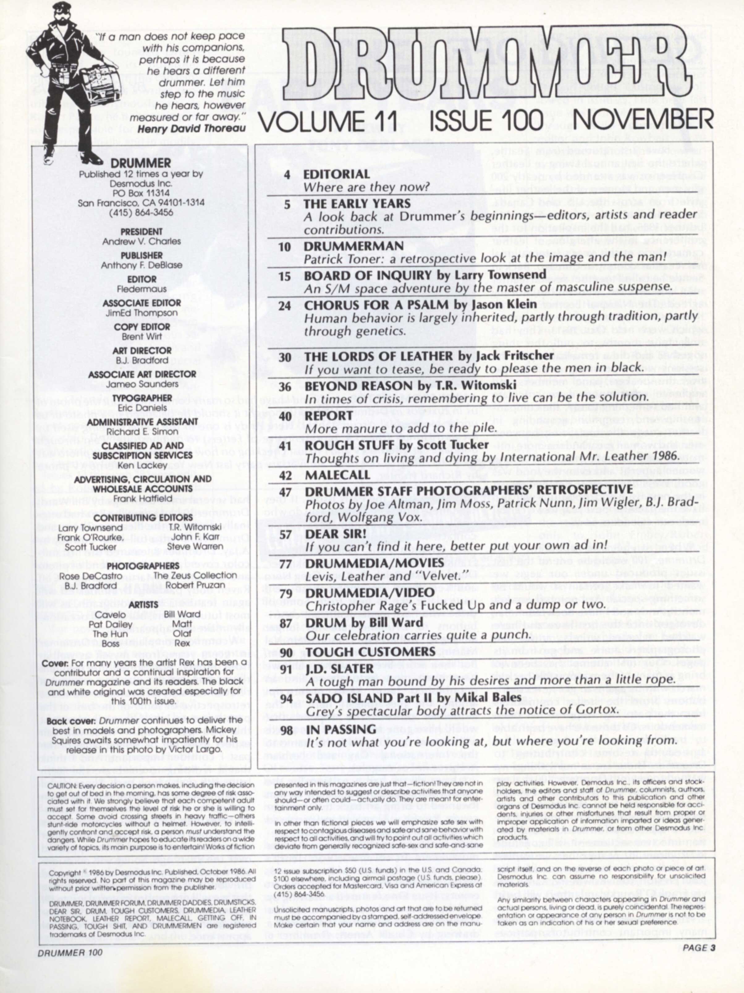 Editor’s Note: In 1986, Anthony F. DeBlase and Andrew Charles, Desmodus Inc., purchased Drummer from publisher John Embry