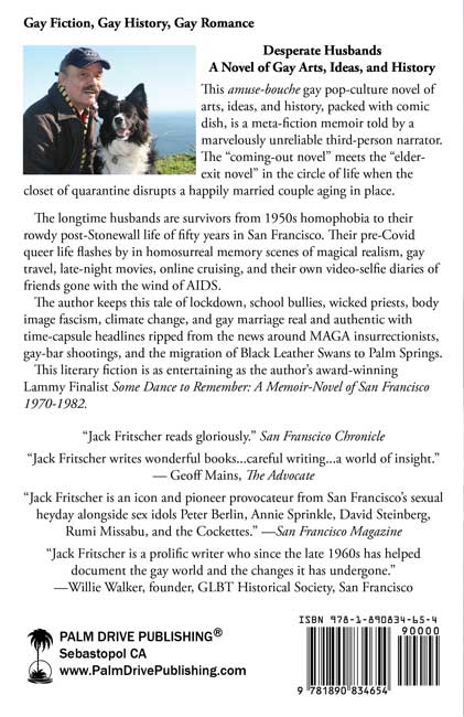The longtime husbands are survivors from 1950s homophobia to their rowdy post-Stonewall life of fifty years in San Francisco. Their pre-Covid queer life flashes by in homosurreal memory scenes of magical realism, gay travel, late-night movies, online cruising, and their own video-selfie diaries of friends gone with the wind of AIDS.